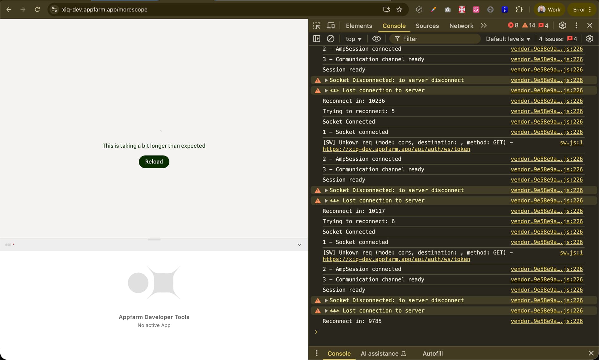 We are having an issue with dev and test not loading, ending up in a forever Reconnect (but it’s not my internet, all developers are having the same issue on multiple wifis)