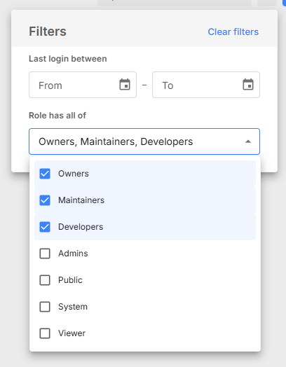 That way I can get an overview of all Users Accounts with either “Owner, Maintainers or Developers” role. With todays functionality “Role has all of”, I need to be very specific.