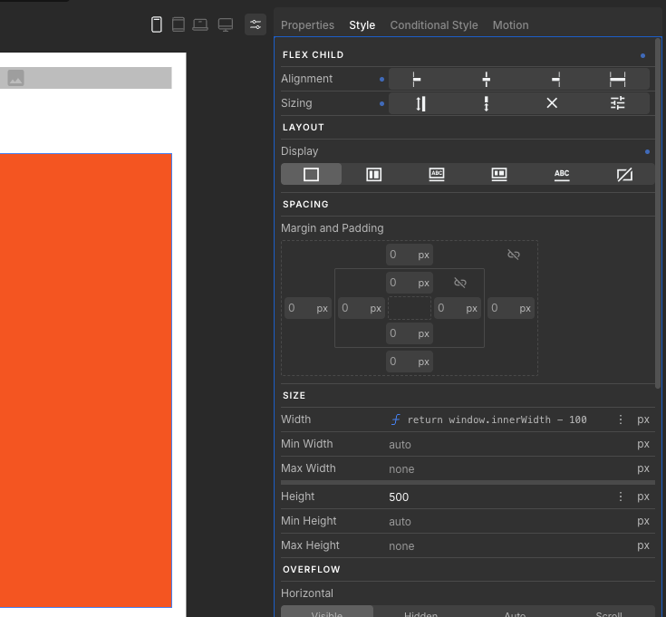 Here’s the Create setup for the mobile view (window.innerWidth - 100):